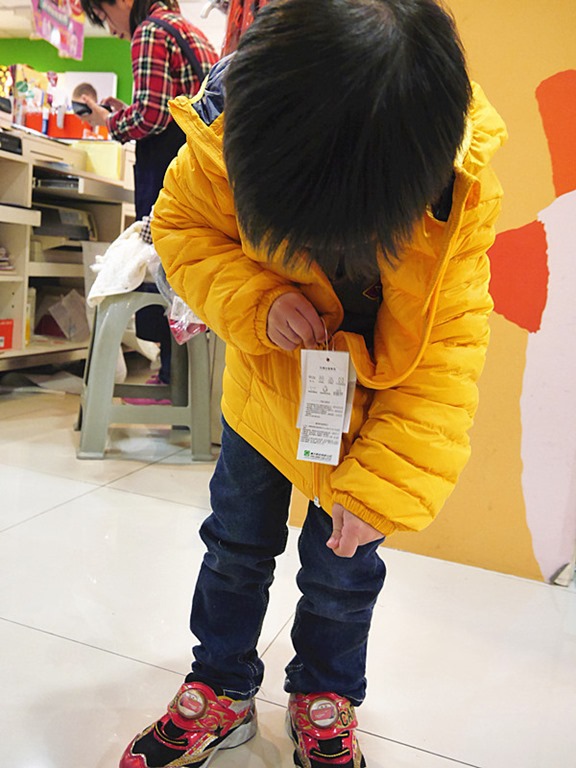 繽紛、鮮明的色調就是小孩兒的專屬色~後來也讓小維哥試穿了藍色,但最後~~黃色一致大獲好評!