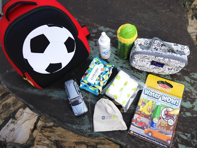 哥哥包裡的基本配備:水壺、太陽眼鏡、水清淨抗菌液、面紙、玩具or繪本、餐碗