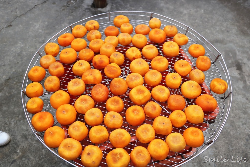 一般日曬7-9天,第三天開始按摩壓屁股,若再加長日曬時間,柿餅就會佈滿白色結晶物,成了「柿乾」