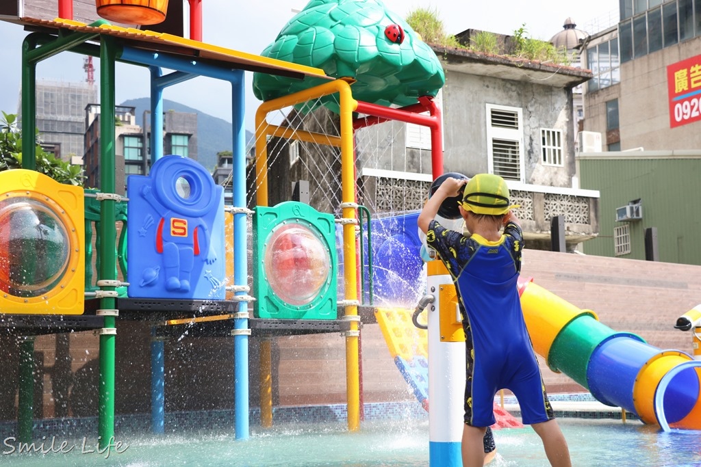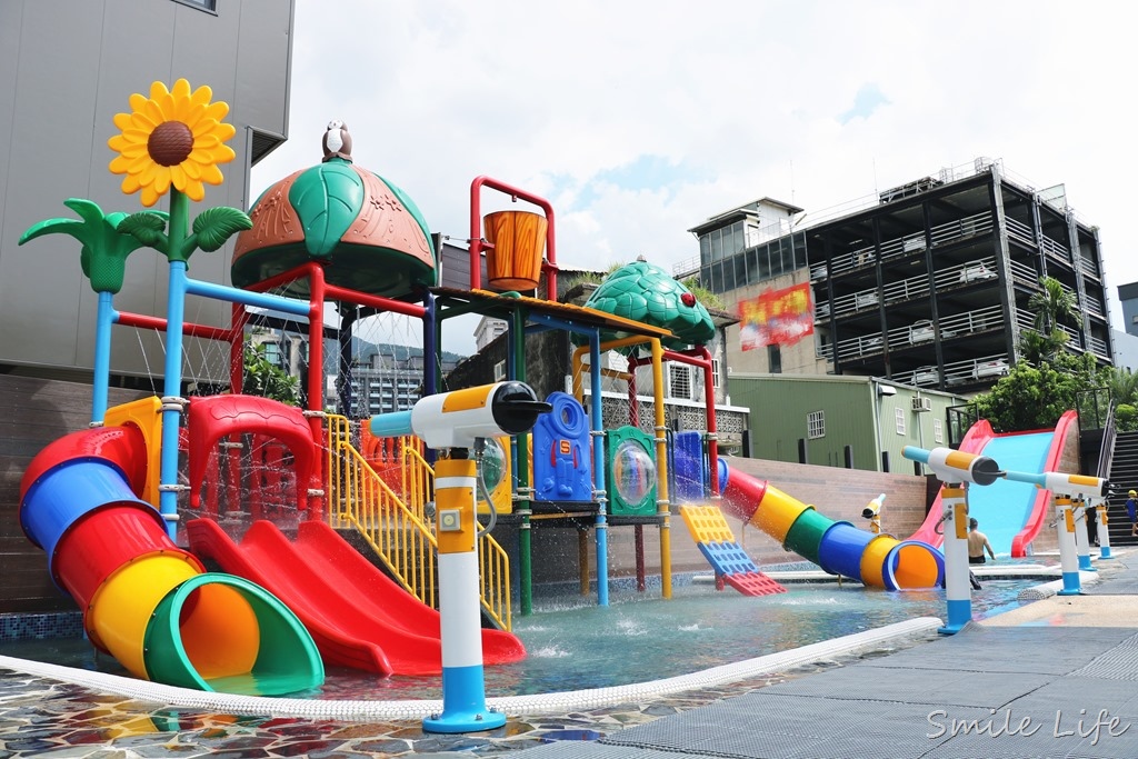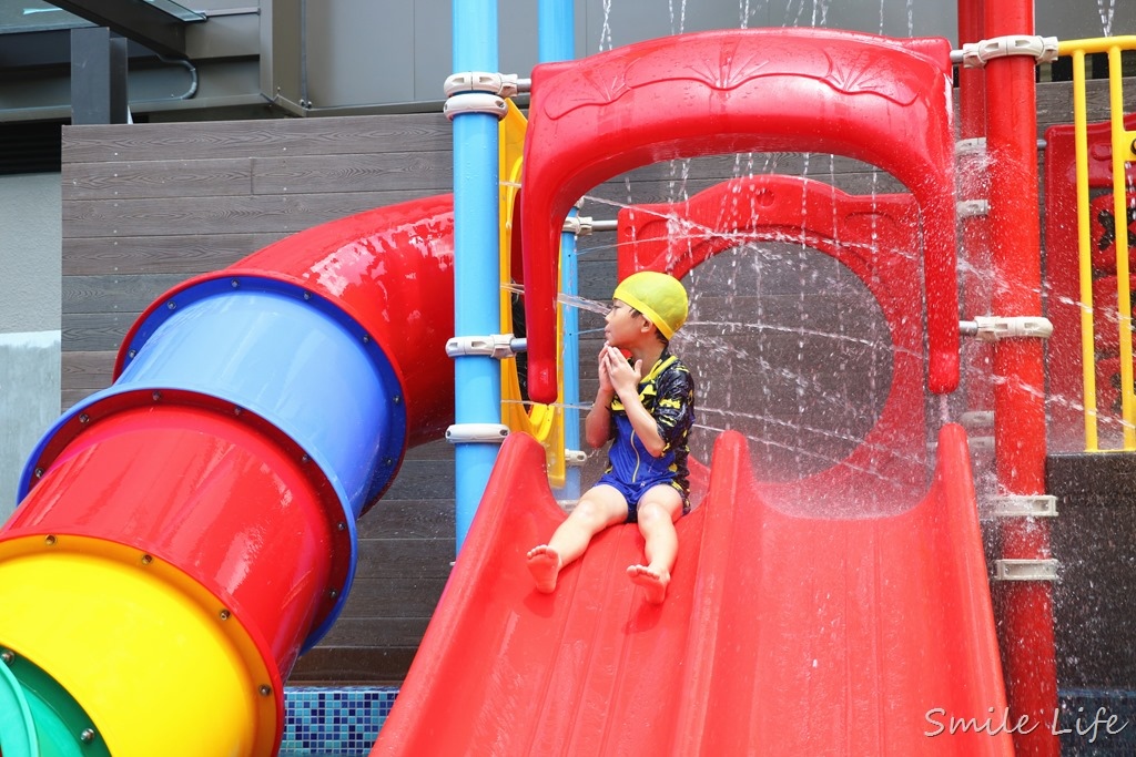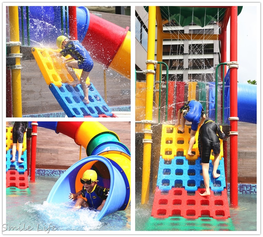 結合水槍、多道水柱關卡淺水溜滑梯設施,光小孩爬上爬下就玩到翻掉